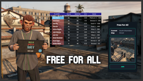 High-performance free-for-all system with zones, scoreboards and kill tracking.